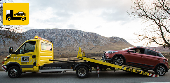 Este serviciul de transport al autovehiculului avariat catre o unitate reparatoare din reteaua A24.